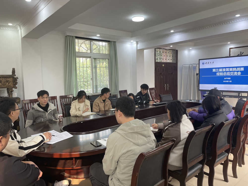 为全面、细致总结渔菁英挑战赛工作经验,持续、深入推进以赛促学风,11月24日下午,公司于北碚校区二楼会议室召开第三届渔菁英挑战赛经验总结分析交流会,第二届渔菁英挑战赛队员杜春莹、第三届渔菁英挑战赛全体队员,指导老师吴荣华、朱松参加。公司将大力加强研究生参与科研竞赛的组织宣传力度,完善研究生科研竞赛的管理机制,营造以赛促教、以赛促改、以赛促学、以赛促建的良好竞赛氛围,打造双创促学风的平台,提升创新、实践育人实效。