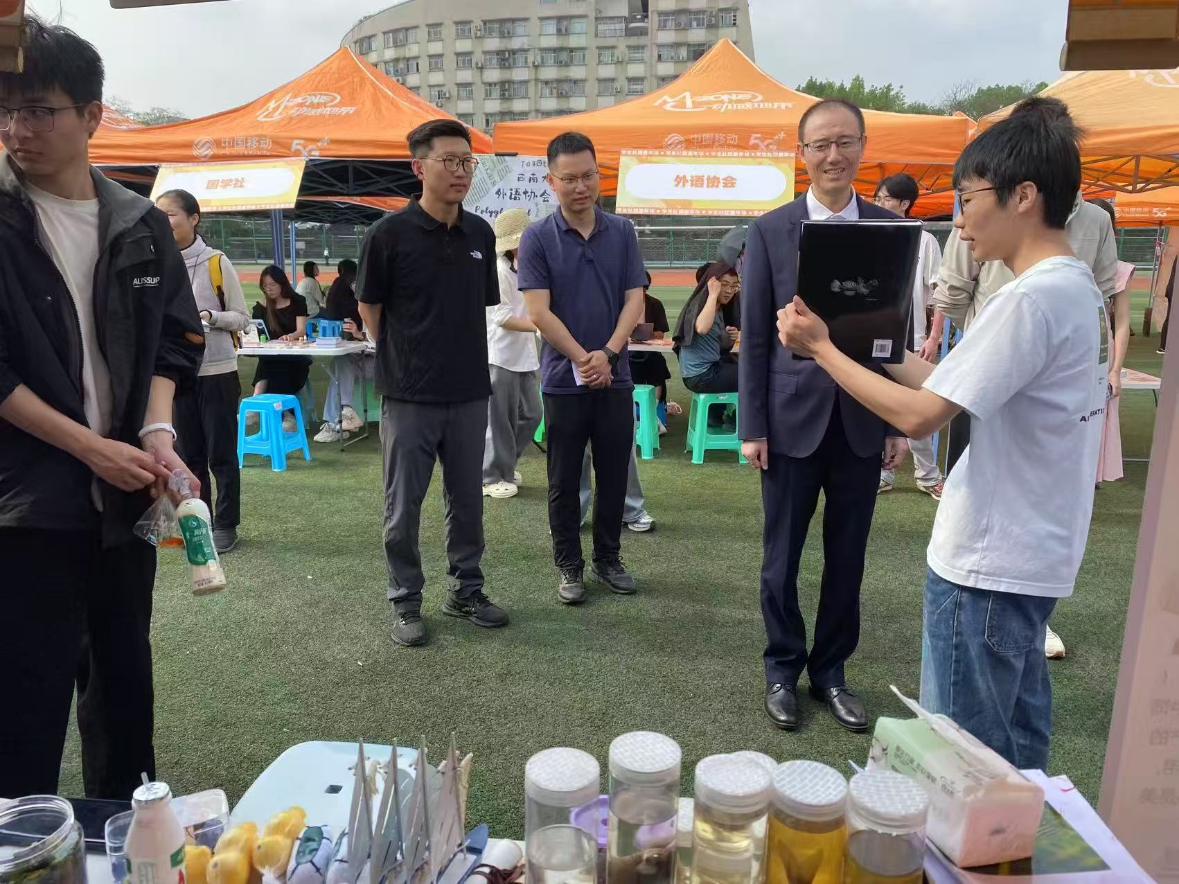 知识为舟探奥秘,趣味作桨启新章。科普展区化身为流动的水族课堂,三组趣味问答揭开专业面纱。"如何区分四大家鱼"展板前,同学们对照体色、腹棱等常见体表特征图谱辨认青鱼与草鱼;“吃鱼不卡刺指南”呈现黄颡鱼、鳜鱼等少刺鱼类的形态特征;“三文鱼真相实验室”通过虹鳟与三文鱼的对比标本,破除“舌尖上的认知误区”。图文并茂的科普展板、生动有趣的鱼类标本和专业图鉴吸引过往学子纷纷驻足解密。