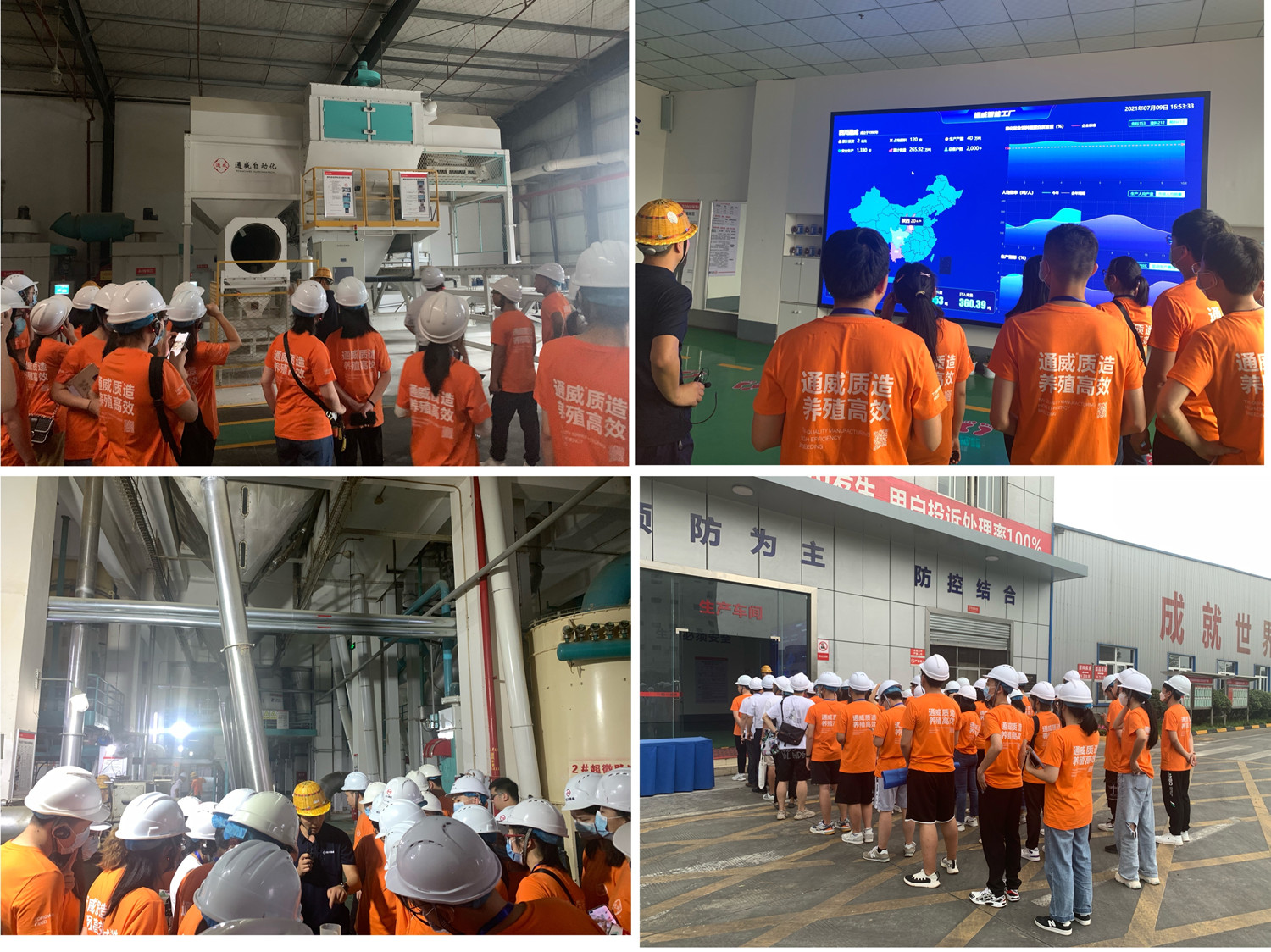 通威起于水产,直至今日水产饲料仍是通威的主业之一。实践团的第二站来到了四川通威饲料有限公司并进行了一日两晚的参观学习。在此期间,华西一区总经理助理兼四川通威总经理彭金钢与四川通威人力资源部经理白丽芬为实践团授课,就《通威质量方针的通威文化及故事》生动讲述了通威的文化历史以及企业精神;华中一区品管总监李敏英做了题为《一颗饲料的诞生》主题报告,从原料、技术到标准化生产模式等方面简介了高质量饲料的生产过程。学习之后,实践团踏上“通威之路”历史长廊,一起感悟通威投身水产的报国情怀。在其后的实地考察过程中,同学们参观了现代标准化工厂车间,实地感受到了饲料诞生的全过程。智能化、集约化和规模化发展的现代水产饲料生产激起了同学们的极大兴趣,在参观学习之后,所有同学纷纷进行复盘交流并利用思维导图等工具进行小组输出感悟,展示学习参观的成果。