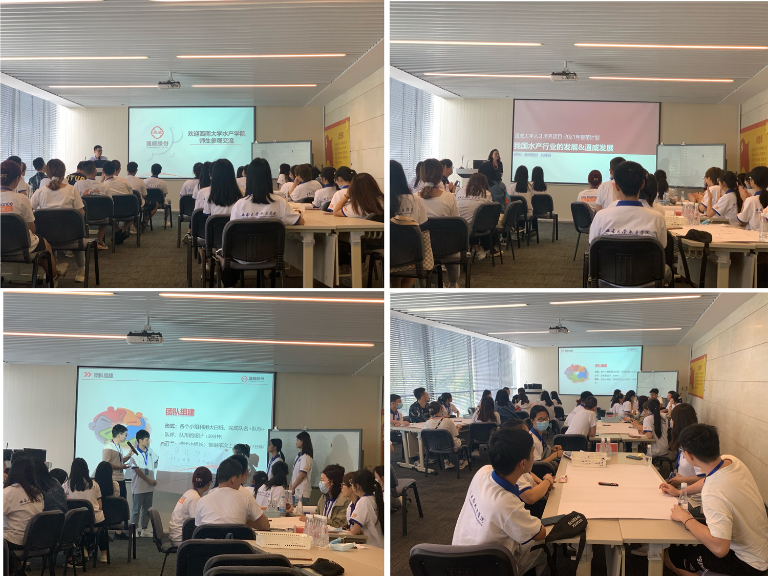 社会实践团首先来到成都市通威国际中心。经过短暂的休整与小组组建工作,通威股份有限公司总裁助理刘辉芬研究员于工会二楼教室作了题为《我国水产行业的发展&通威发展》的报告,简要分析了我国水产养殖及水产饲料的发展概况,详细介绍了通威股份有限公司在水产养殖现代化升级中所做的大量工作。