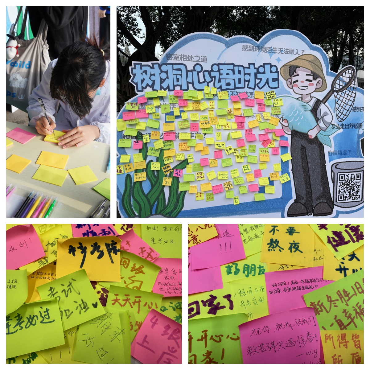 在操场的一角,“树洞心语时光”的展台前,新生们围得水泄不通,正悄悄写下自己的小心思。有的困惑于未来的方向,有的则满怀对未来的憧憬,一张张便利贴,承载着他们的心声。