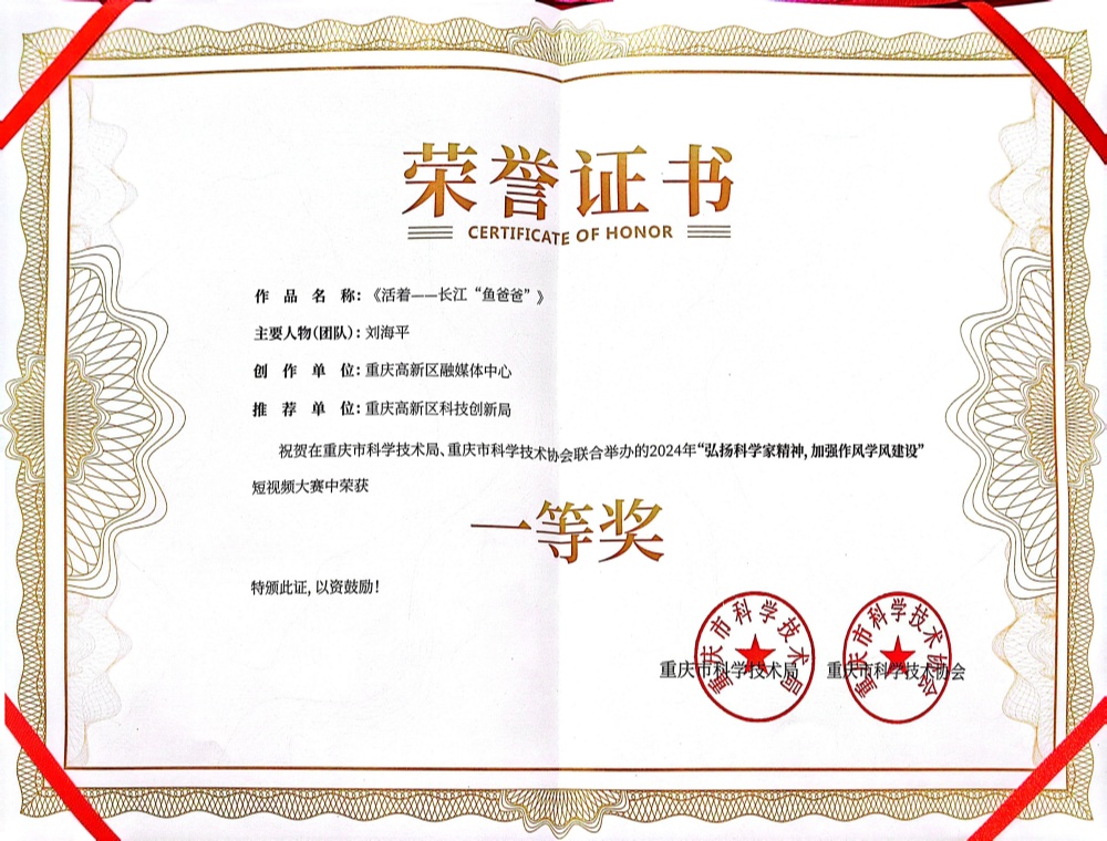 12月19日,由重庆市科学技术局、重庆市科学技术协会主办的“弘扬科学家精神,加强作风学风建设”短视频大赛颁奖典礼成功举办,重庆高新区融媒体选报的K1体育官方网站西部(重庆)科学城种质创制大科学中心刘海平教授团队的故事作品《活着—长江“鱼爸爸”》荣获一等奖。