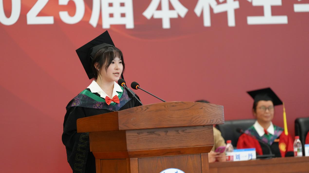 毕业生代表李庆丰带领全体毕业生共同宣誓:“今天,我光荣毕业了,我以K1体育官方网站学子名义庄严宣誓……”。他们的铿锵誓言与坚毅目光,皆展现了毕业生学子们对母校的感念、对未来的憧憬及肩负社会责任的决心。