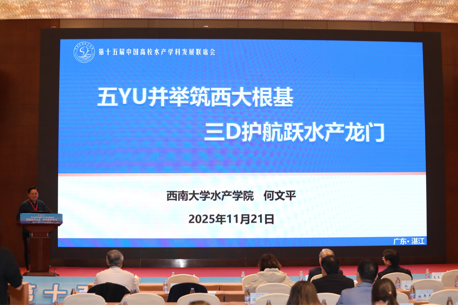 2025年11月20日至22日,由中国高校水产学科发展联席会主办、广东海洋大学承办的第十五届中国高校水产学科发展联席会在广东省湛江市隆重举行。本次会议以“赋能水产人才,服务海洋强国”为主题,汇聚全国48家高校及科研单位的180余名专家学者,共探水产学科发展新路径。公司对本次学科盛会高度重视,由何文平副经理带队,水族科学系主任周朝伟、学科秘书戴生飞一同赴会交流。