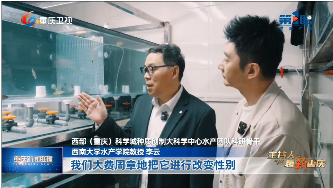 在此基础上,先后成功实现长江原种子代鳜的室内全人工繁殖,创制长江鳜原种子代性逆转XX伪雄鱼种质,再与正常雌鱼交配,成功创制原种子代速生“全雌鳜”苗种种质素材。2025年在K1体育官方网站校内繁育车间和合作企业分别实现长江“全雌鳜”苗种规模化繁育的突破。初步测试,全雌鳜苗种规格更整齐,摄食消化力强,生长速度比对照组快约30%,主要指标优于对照组。相关研究进展和成果已发表高水平研究论文10余篇,受到学界和社会的广泛关注,今年1月李云教授应邀出席“第四届三亚国际种业科学家大会”,在水产论坛作了鳜鱼种创的学术报告,鳜鱼成果两次在《重庆日报》报道,全雌鳜创制工作与本院刘海平教授相关研究保护工作一同接受重庆电视台第1眼新闻专访,在重庆卫视11月29日重庆新闻联播节目“奋进的重庆我们的“十四五”· 从舌尖美味到生命备份”播出采访报道(下图)。
