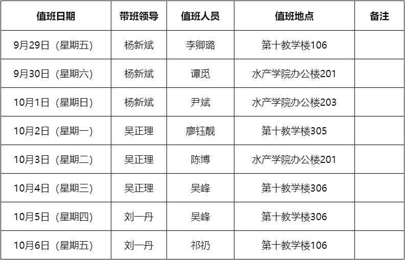 备注:值班时间为上午8:30-12:00,下午14:30-17:30